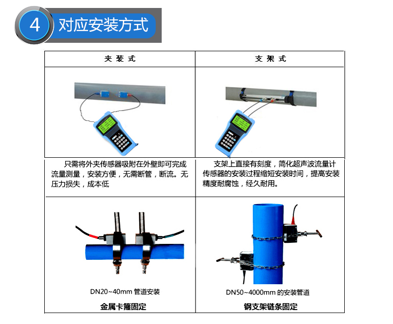 外夾式或者管段式超聲波流量?jī)x表是以"速度差法"為原理,測(cè)量圓管內(nèi)液體流量的儀表。它采用了先進(jìn)的多脈沖技術(shù)、信號(hào)數(shù)字化處理技術(shù)及糾錯(cuò)技術(shù),使流量?jī)x表更能適應(yīng)工業(yè)現(xiàn)場(chǎng)的環(huán)境,計(jì)量更方便、經(jīng)濟(jì)、準(zhǔn)確。產(chǎn)品達(dá)到國內(nèi)外先進(jìn)水平,可廣泛應(yīng)用于石油、化工、冶金、電力、給排水等領(lǐng)域。