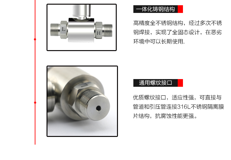 SIN-6100系列一體化差壓變送器采用OEM硅壓阻式差壓充油芯體組裝而成。外殼為全不銹鋼結(jié)構(gòu),兩個(gè)壓力接口為螺紋連接,可直接安裝在測(cè)量管道上或通過引壓管連接。