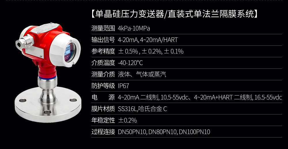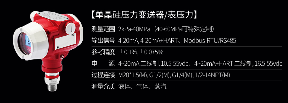 單晶硅壓力變送器用于測(cè)量液體、氣體或蒸汽的液位、密度、壓力,然后將其轉(zhuǎn)變成4-20mAHART電流信號(hào)輸出