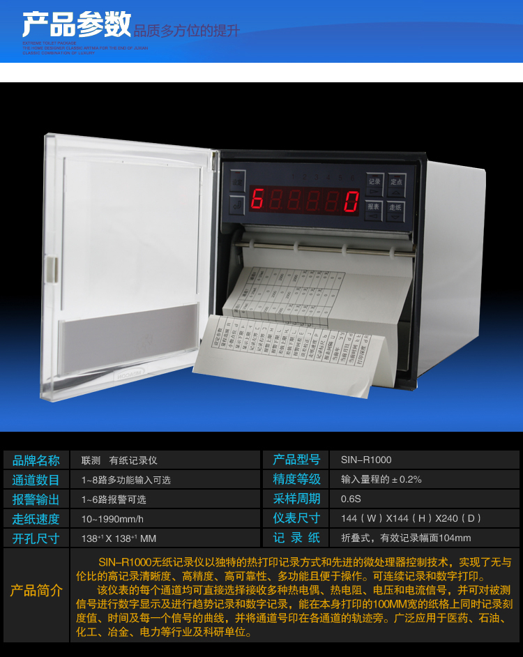 有紙記錄儀在測量,運算,顯示,打印等功能上有了很大的提高可以很方便的實現(xiàn)網(wǎng)絡(luò)的連接。有紙記錄儀采集的數(shù)據(jù),常用的有:溫度、壓力、流量、液位、電壓、電流、濕度、頻率、振動、轉(zhuǎn)速等。
